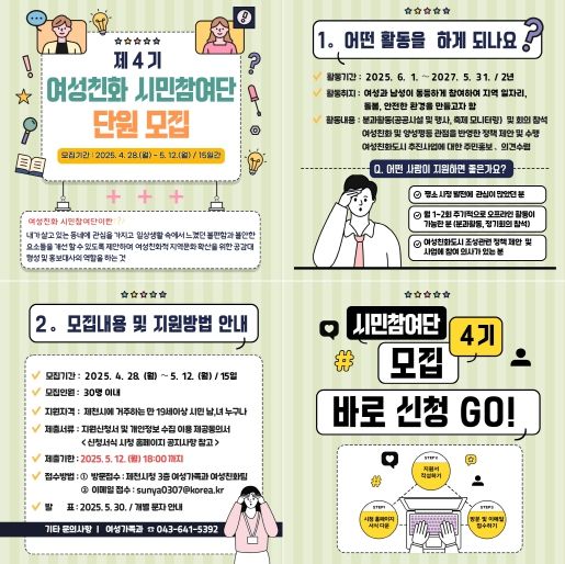 [경남도민뉴스=박만수 기자] 제천시는 함께 참여하여 함께 누리는 여성친화도시 조성을 위한‘제4기 여성친화 시민참여단’을 5월 12일까지 공개 모집한다고 밝혔다.