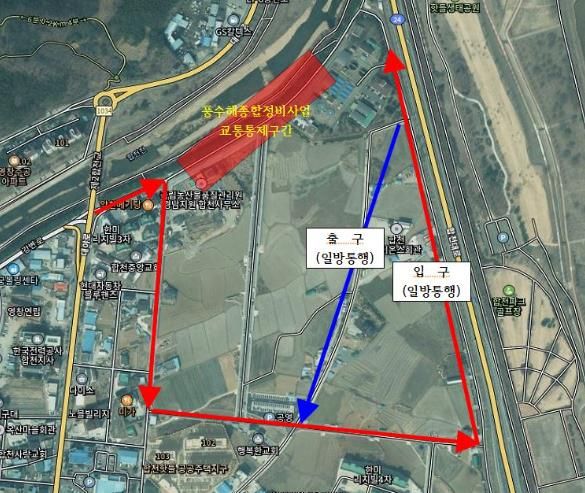 공사 및 진입도로 우회 안내에 따르면, 현재 핫들생태공원 주요 진입도로 구간에서 풍수해생활권 종합정비사업이 진행 중이다.