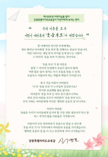 [경남도민뉴스=류종길 기자] 강원특별자치도교육청은 제103주년 어린이날을 맞아 도내 어린이에게 희망과 응원의 메시지를 담은 교육감 서한문을 발표했다.