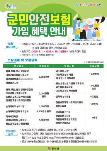 [경남도민뉴스=김춘호 기자] 합천군은 군민들의 안전을 위해 2025년 5월 1일부터 1년간 전 군민을 대상으로 '군민안전보험'을 시행한다고 2일 밝혔다.