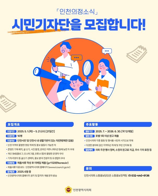 [경남도민뉴스=김용욱 기자] 인천광역시의회에서 의정활동과 다양한 지역 소식을 전할 시민기자를 찾고 있다.
