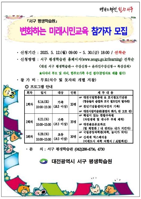 [경남도민뉴스=도문호 기자] 대전 서구 평생학습원은 민주시민교육의 일환으로‘2025년 변화하는 미래시민교육’ 참가자를 5월 12일부터 30일까지 모집한다고 밝혔다.