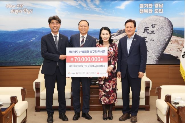 [경남도민뉴스=구인애 기자] 경상남도는 8일 대한건축사협회와 소속 경상남도건축사회 및 17개 시도건축사회가 경남 지역 산불 피해 주민들을 돕기 위한 성금 7천만 원을 기탁했다고 밝혔다. 성금 전달식은 이날 오후 3시 30분, 경남도청에서 열렸다.