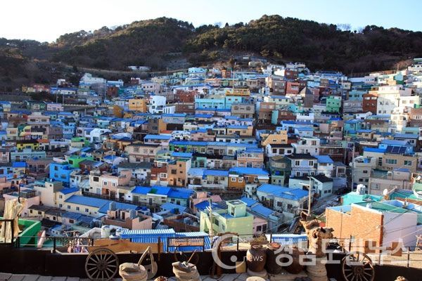 입구에 들어서니 감천문화마을이 한눈에 들어온다. 파스텔 색조의 아름다운 색채가 눈길을 사로잡았다. 산자락을 따라 질서정연하게 늘어선 형형색색의 건물들이 저마다의 개성을 뽐내는 듯했다.