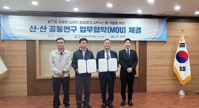 [경남도민뉴스=백상현 기자] 대구공공시설관리공단 서부사업소와 (주)그린텍은 5월 9일 ‘펌프를 활용한 슬러지 혼합탱크 교반시스템 공동기술개발’ 추진을 위한 업무협약(MOU)을 체결했다.