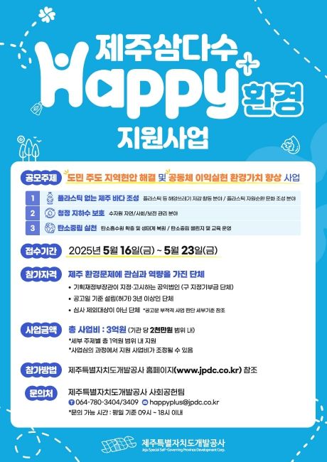 제주삼다수를 생산·유통하는 제주특별자치도개발공사는 “도민과 함께 해결하는 제주의 환경문제”라는 슬로건을 내걸고 ‘제주삼다수 Happy+ 환경 지원사업’을 추진한다고 밝혔다.