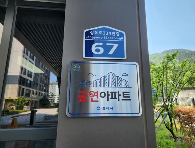 김해시는 국민건강증진법에 따라 2017년부터 공동주택 금연구역 지정 사업을 시작했으며 지정 시 금연 아파트 지정 현판, 현수막, 금연구역 표시재를 제공한다.