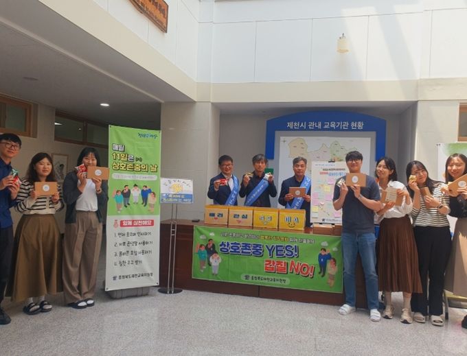 [경남도민뉴스=박만수 기자] 충청북도제천교육지원청은 ‘5월 상호존중의 날’을 맞이하여 2025년 5월 13일 오전 현관 로비에서 직원들을 대상으로 ‘공감LIVE 묵찌빠 배틀’ 이벤트 캠페인을 열어 눈길을 끌었다,