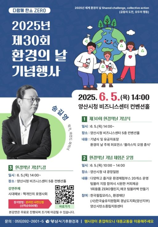 [경남도민뉴스=최미정 기자] 양산시는 6월 5일 양산시청 광장 및 비즈니스센터 컨벤션홀에서 제30회 환경의 날을 맞아 ‘다함께 탄소 ZERO’를 주제로 환경실천문화 확산과 시민 참여형 환경의식을 고취하기 위한 기념행사를 개최한다고 밝혔다.