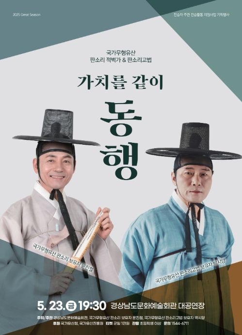 [경남도민뉴스=구인애 기자] 경남문화예술회관은 오는 23일 오후 7시 30분 대공연장에서 국가무형유산 판소리 적벽가 &판소리고법 – 가치를 같이 ‘동행’ 공연을 개최한다고 밝혔다.