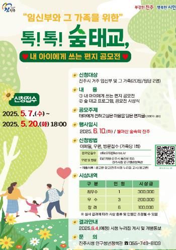 공모전과 행사 참석 신청 대상은 진주시에 거주하는 임신부 20명과 그 가족 20명(총 40명)을 대상으로 하며, 접수 마감일은 5월 20일이다.