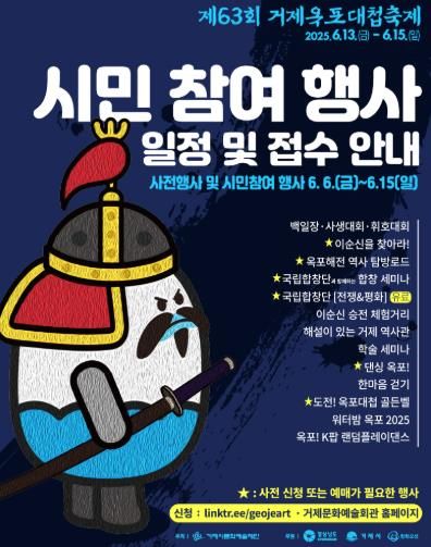 [경남도민뉴스=김부경 기자] 거제시 대표 호국문화축제인 ‘제63회 거제옥포대첩축제’가 6월 13일 오후 7시 30분 개막식을 시작으로 15일까지 3일 동안 옥포수변공원 일원에서 개최된다.