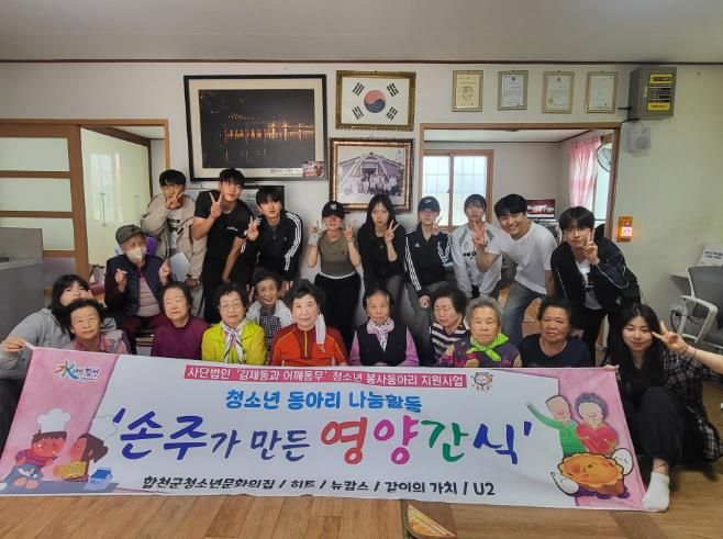 [경남도민뉴스=김춘호 기자] 합천군 청소년문화의집의 청소년 봉사동아리(히트, 뉴캅스, 같이의 가치, U2)는 지난 10일 ‘손주가 만든 영양간식’ 프로그램을 통해 직접 만든 간식을 합천읍 내 경로당 2곳에 전달했다.