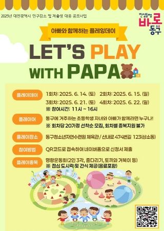 참여 대상은 동구에 거주하는 아빠와 초등학생 자녀로 회당 20가정을 선착순 모집하며, 신청은 동구청 누리집 공고 또는 포스터 내 정보무늬(QR코드)를 통해 접수할 수 있다.
