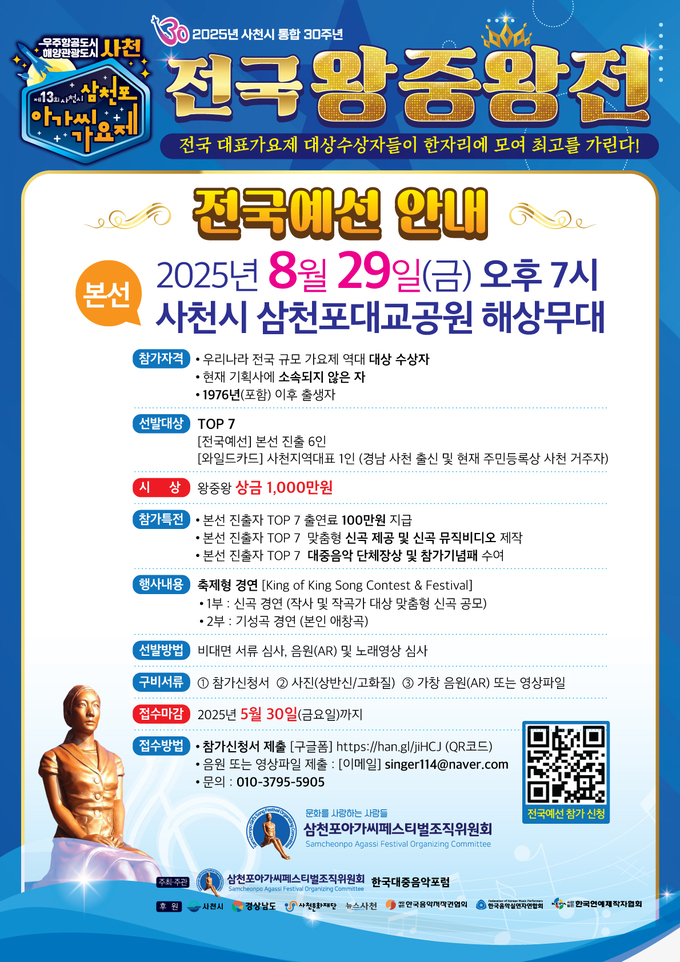 올해 행사는 사천시 통합 30주년을 기념해 우리나라 가요사(史)상 최초, 맞춤형 신곡 경연 스타발굴이라는 새로운 콘셉트로 기획됐으며, 지역 문화예술과 시민 참여형 축제로서의 위상을 한층 높일 예정이다.