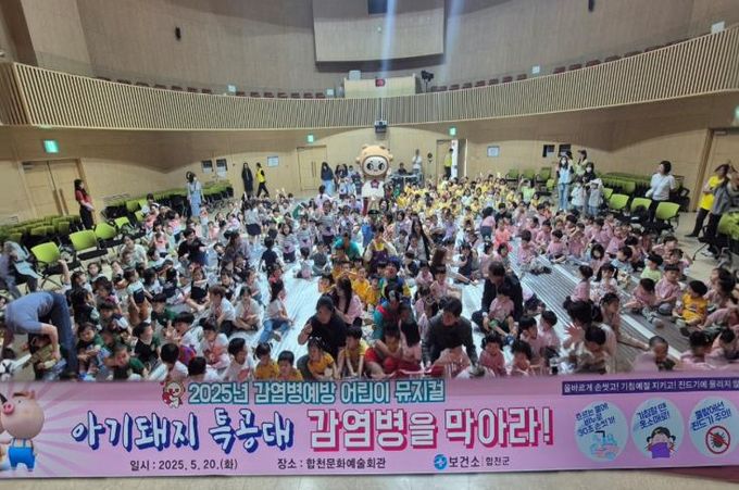 [경남도민뉴스=김춘호 기자] 합천군은 20일 합천문화예술회관 대강당에서 관내 어린이집 및 유치원 원아 350여 명을 대상으로 감염병 예방을 주제로 한 어린이 뮤지컬 ‘아기돼지 특공대 감염병을 막아라!’를 성황리에 개최했다.