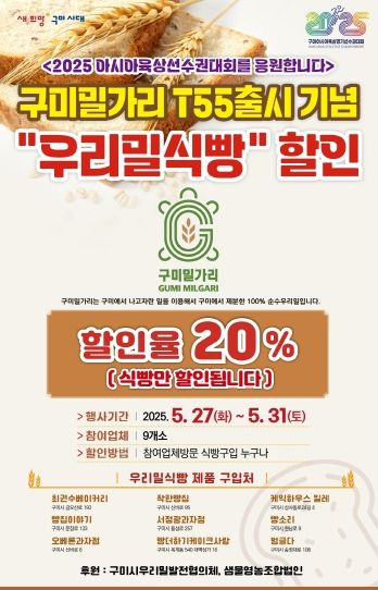 이번 구미밀가리 출시를 기념해 5월 27일부터 31일까지 구미 지역 제과점 9곳이 참여하는 식빵 할인 행사가 진행된다. 해당 제과점에서는 구미밀가리(T55)를 100% 사용해 만든 식빵을 20% 할인된 가격에 판매하며, 지역 시민과 대회 방문객 모두가 참여 가능하다.
