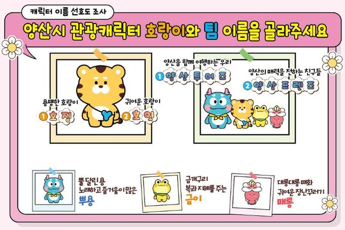 [경남도민뉴스=최미정 기자] 양산시는 시민과 함께 만들어가는 관광캐릭터 브랜드 구축을 위해, 작년 디자인 공모전을 통해 선정된 관광캐릭터 4종 중 하나인 호랑이 캐릭터의 이름과 팀명을 대상으로 선호도 조사를 오는 5월 말까지 진행한다고 밝혔다.