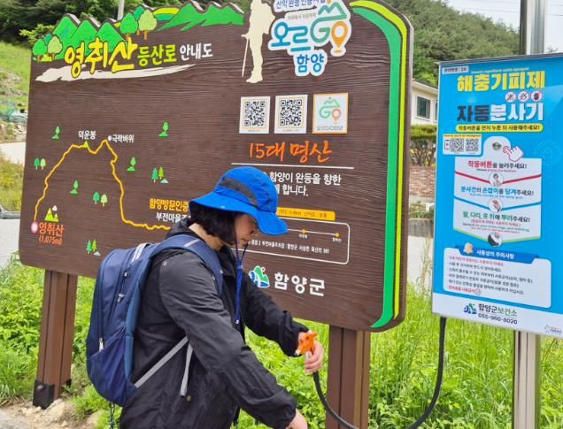 [경남도민뉴스=장광동 기자] 함양군은 최근 산악완등 인증사업 ‘오르GO 함양’과 연계해, 관내 주요 등산로 10곳에 해충기피제 분사기를 설치했다고 22일 밝혔다.