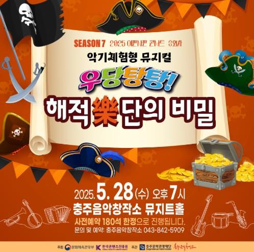 [경남도민뉴스=박만수 기자] 충주음악창작소는 오는 5월 28일 오후 7시, 창작소 내 뮤지트 홀에서 2025 음악창작소 프로그램 운영지원 사업의 일환으로 [이판사판 콘서트 시즌 7] 세 번째 공연, 『우당탕탕! 해적樂단의 비밀』을 선보인다.