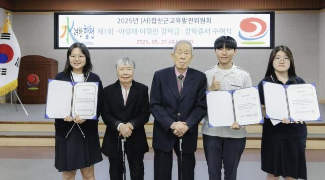 [경남도민뉴스=김춘호 기자] 합천군교육발전위원회은 5월 21일 합천군청 대회의실에서 ‘이성해‧이명란 장학금’ 장학증서 수여식을 개최하고, 지역 고등학생 6명에게 장학증서를 전달했다.