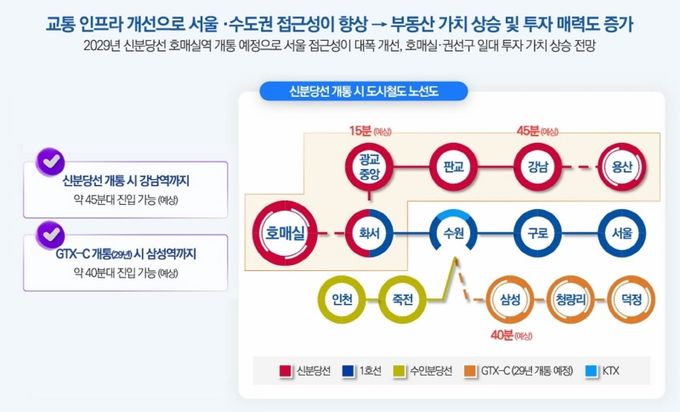 또한 매머드급 개발 호재가 풍부해 향후 프리미엄 확보도 기대된다. 특히, 호매실은 신분당선 개통 및 광역급행철도 GTX-C노선 개통이라는 겹호재가 예정돼 있다. 강남 접근성이 대폭 강화될 전망으로, 수도권 남부 순환 철도망의 중심지로 호매실이 급부상 할 것이라는 예측도 나온다.