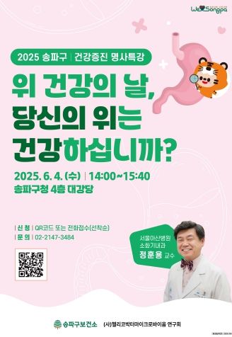 [경남도민뉴스=김완호 기자] 서울 송파구가 오는 6월 4일 오후 2시 구청 대강당에서 올해 두 번째 건강증진 명사특강, '위 건강의 날, 당신의 위는 건강하십니까?'를 개최한다고 알렸다.