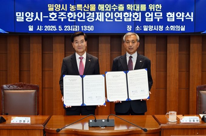 [경남도민뉴스=나희준 기자] 밀양시는 23일 시청 소회의실에서 호주한인경제인연합회(회장 강흥원)와 농특산물의 수출 확대를 위한 업무협약(MOU)을 체결했다고 밝혔다.