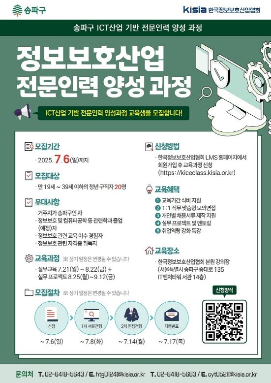 한국정보보호산업협회에서 운영을 맡아 ‘정보보호 컨설팅’, ‘보안관제’, ‘보안 솔루션 엔지니어’ 등 기업의 채용 직무를 반영한 실무 위주 교육과정으로 준비했다. 또, 정보보호 전문가와 함께하는 멘토-멘티 실무프로젝트, 1:1 모의 면접, 개인별 채용서류 제작지원, 취업 특강 등 다양한 혜택도 제공한다.