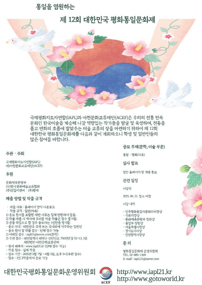 [경남도민뉴스=백형찬 기자] 국제평화지도자연합(IAPL)과 재)아천문화교류재단(ACEF)이 공동 주최하는 행사로 대한민국 평화통일문화제는 문학 및 미술 대회가 공모전으로 열리며, 시상식에서는 특별공연이 펼쳐지며, 유치부, 학생부 및 일반 누구나 참여할 수 있으며, 5월 7일부터 6월 5 까지 접수하여 6월 21일에 시상하는 통일을 염원하는 제12회 대한민국 평화통일문화제를 개최한다고 밝혔다.