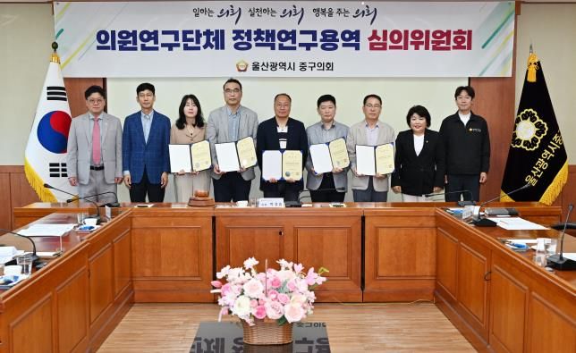 중구의회 26일 의원연구실에서 박경흠 의장을 비롯해 연구단체 대표 의원과 심의위원 등이 참석한 가운데 ‘2025년 의원연구단체 정책연구용역 심의위원회’를 열었다.