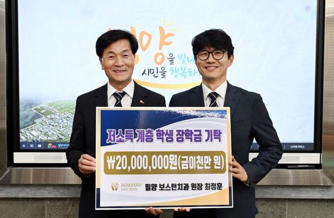 [경남도민뉴스=나희준 기자] 밀양시는 26일 밀양 보스톤치과에서 시장실을 방문해 지역의 저소득계층 학생들을 위한 장학금으로 사용해달라며 장학금 2천만원을 기탁했다고 밝혔다.