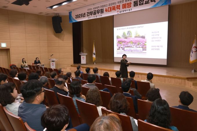 [경남도민뉴스=최재경 기자] 울산 동구는 5월 26일 오후 2시부터 오후 6시까지 동구청 5층 중강당에서 5급 이상 공직자 40여 명을 대상으로 ‘2025년 간부공무원 4대 폭력 예방 통합교육’을 실시했다.