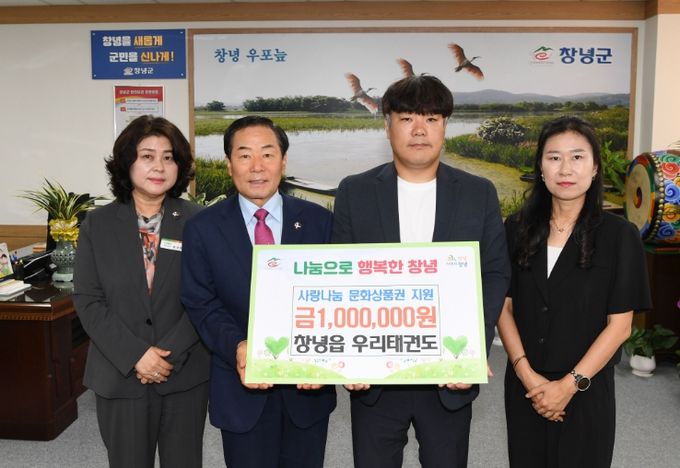 [경남도민뉴스=김병현 기자] 창녕군은 지난 26일, 창녕읍에 소재한 우리태권도(관장 박상진)에서 관내 저소득 아동의 문화생활 지원을 위해 문화상품권(1만 원권) 100매를 기탁했다고 밝혔다.