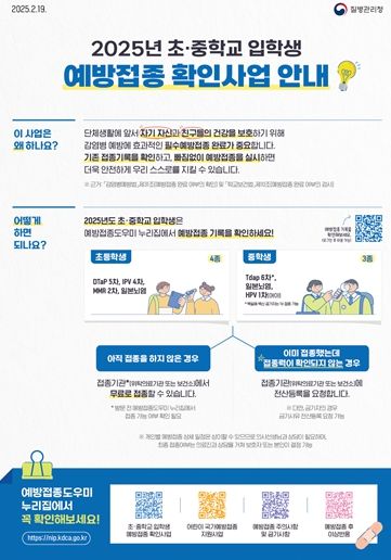 초등학교 입학생은 2018년생으로 4~6세에 시행하는 필수 예방접종 4종(디프테리아·파상풍·백일해(DTap), 폴리오(IPV), 홍역·유행성이하선염·풍진(MMR), 일본뇌염 백신), 중학교 입학생은 2012년생으로 11~12세에 시행하는 필수 예방접종 3종(디프테리아·파상풍·백일해(Tdap), 일본뇌염 백신, HPV(여학생)) 접종 완료 여부를 확인해야 한다.