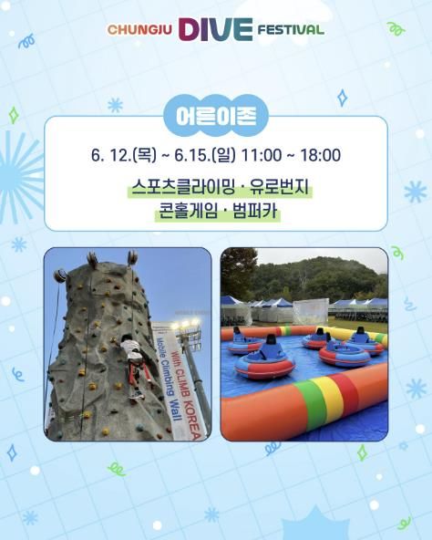 에어바운스, 물놀이존, 다이브기차, 스포츠클라이밍, 유로번지, 웰빙 건강체험 등 세대별 맞춤형 체험존이 운영되며, 감성버스 투어 등 충주의 관광지와 연계한 체험 프로그램도 마련된다.