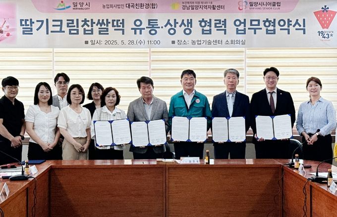 [경남도민뉴스=나희준 기자] 밀양시는 28일 농업기술센터 소회의실에서 지역 대표 농산물인‘밀양딸기’를 활용한 딸기크림찹쌀떡의 안정적 생산과 지역 유통 확대를 위한 업무협약식을 개최했다.