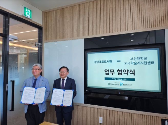 [경남도민뉴스=구인애 기자] 경남대표도서관(관장 신민철)은 28일 오후 2시 부산대학교 도서관에서 부산대학교 외국학술지원센터(FRIC)와 우주항공·방산·원자력 관련 외국학술지 자원공유 및 도서관 서비스 확대를 위한 업무협약을 맺었다고 밝혔다.