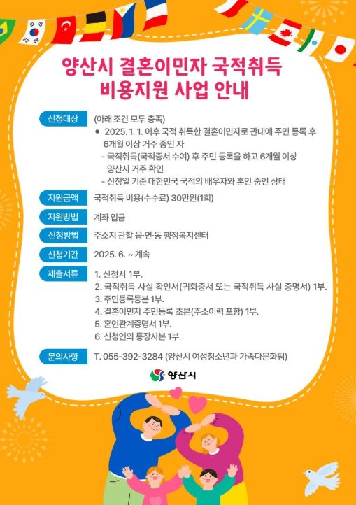 결혼이민자 국적취득 비용 지원 사업은 2025. 6. 2.부터 주소지 관할 행정복지센터로 방문하여 신청이 가능하며, 자세한 사항 및 문의 사항은 양산시청 여성청소년과로 하면 된다.