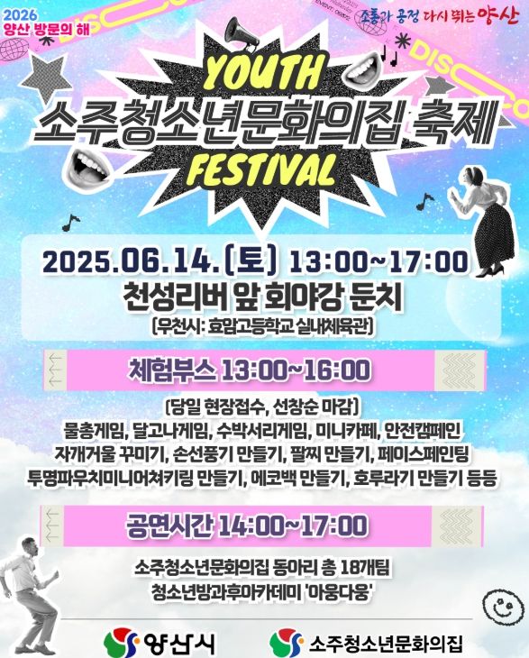 [경남도민뉴스=최미정 기자] 양산이 다시 한번 청소년들의 에너지와 열정으로 들썩인다. 양산시는 소주청소년문화의집 축제 ‘우리에게 여름은 없다!’가 오는 6월 14일 오후 1시부터 5시까지, 천성리버 앞 회야강 둔치 무대에서 펼쳐진다고 밝혔다.