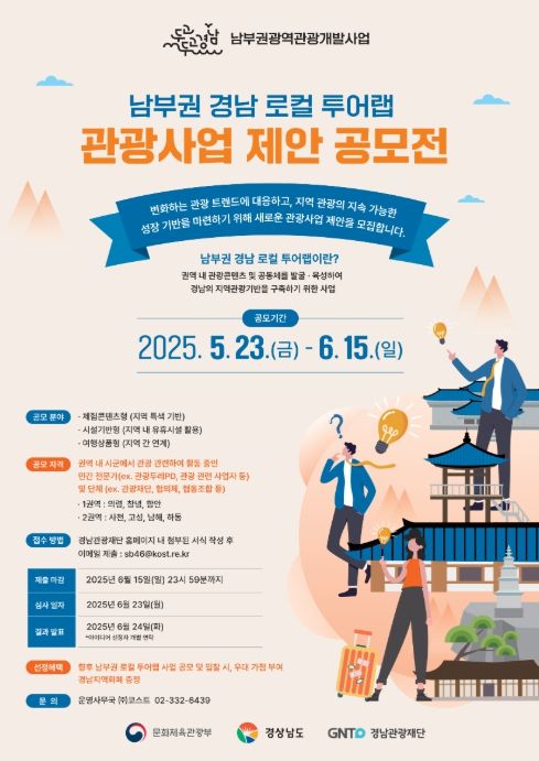 [경남도민뉴스=구인애 기자] 경남관광재단은 지역의 다양한 주체들과 함께 지속 가능한 관광 생태계를 조성을 위해 지역 중간조직을 대상으로 '남부권 경남 로컬 투어랩 관광사업 제안 공모전'을 개최한다고 밝혔다.
