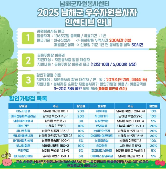 한편, 자원봉사자 인센티브 제도는 2025년 6월부터 12월까지 본격적으로 추진 되며, 자원봉사자증 발급을 원하는 주민은 남해군자원봉사센터로 방문하면 된다.