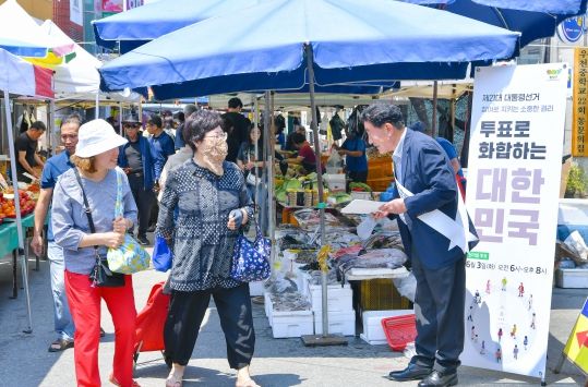 [경남도민뉴스=표재민 기자] 김명기 횡성군수는 제21대 대통령선거를 앞두고 1일 횡성읍 정기 장날, 전통시장을 찾아‘투표참여 캠페인’을 펼쳤다.