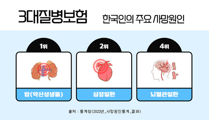 [경남도민뉴스=백형찬 기자] 한국인의 주요 사망원인중에 암, 뇌혈관질환, 심혈관질환은 흔히 3대질병이라 일컬어지며 살아가면서 가장 먼저 대비해야 하는 중대질병으로 항상 강조되고 있다. 이들 질병에 미리 대비하기 위해 가입하는 것이 진단비보험인데, 이러한 3대질병진단비를 중점으로 보장하는 보장성보험이 3대진단비보험 이다. 3대질병진단비보험은 각각의 질병에 주목해서 보장하기도 하지만, 나에게 맞는 추가 특약을 잘 골라서 가입한다면 종합건강보험으로도 충분히 활용도가 높다.