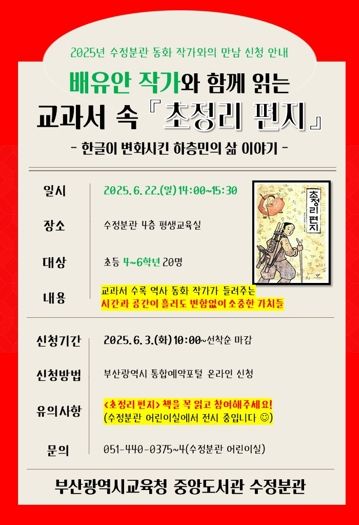 [경남도민뉴스=김채연 기자] 부산광역시립중앙도서관는 오는 22일 오후 2시 수정분관 4층 평생교육실에서 초등학생 20명을 대상으로 ‘배유안 작가와 함께 읽는 교과서 속 '초정리 편지' 북토크’를 운영한다.