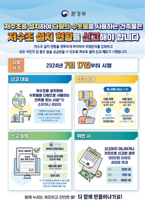 이번 제도는 개정된 수도법 시행에 따른 것으로, 연면적 5,000㎡ 이상 또는 5층 이상 아파트 등 수도법 시행령 제50조 제1항 각 호에 해당하는 시설의 소유자나 관리자는 오는 7월 16일까지 저수조 설치현황을 창녕군 수도과에 반드시 신고해야 한다.