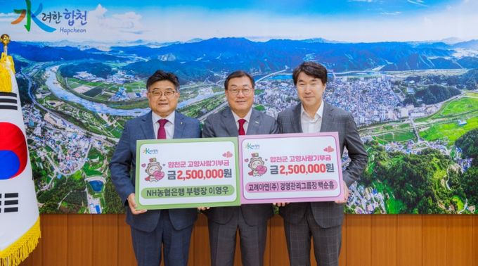[경남도민뉴스=김춘호 기자] 이영우 NH농협은행 부행장(투자상품·자산관리부문)과 백순흠 고려아연(주) 경영관리그룹장은 6월 2일 합천군청을 찾아 고향사랑기부금 총 500만원을 기부하며, 고향에 대한 애틋한 마음이 담긴 특별한 나눔의 시간을 가졌다.