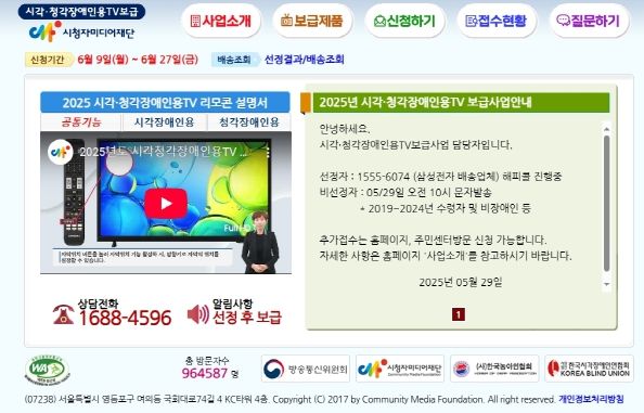 TV 보급은 7월 중 신청자격과 재보급 불가 정보 등을 확인하고, 장애정도와 연령 등을 기준으로 우선순위에 따라 선정 후 배송업체에서 개별 연락 후 보급할 예정이다.