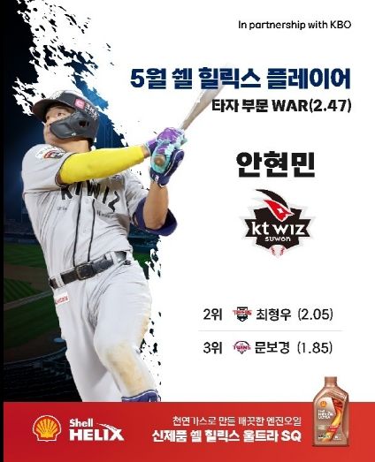 [경남도민뉴스=백형찬 기자] KBO와 한국쉘석유주식회사가 함께 시상하는 ‘쉘힐릭스플레이어’의 2025 신한 SOL뱅크 KBO 리그 5월 수상자로 KT 안현민과 SSG 앤더슨이 선정됐다.