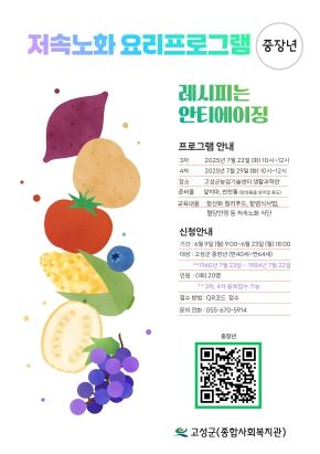 [경남도민뉴스=김태수 기자] 고성군에서 운영 중인 고성군종합사회복지관은 군민들의 건강한 식습관 형성과 노화 예방을 위한 저속노화 요리 프로그램 ‘레시피는 안티에이징’ 참여자를 모집한다.